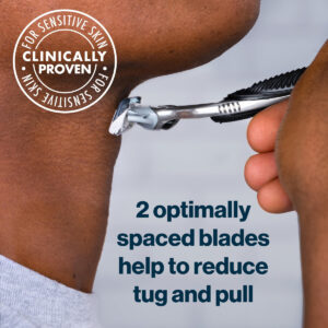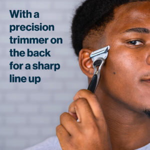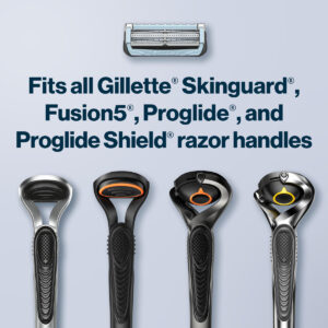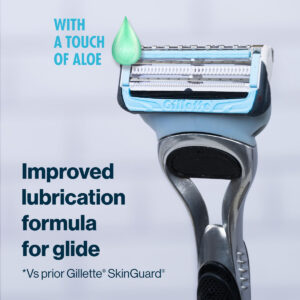 Lâminas de barbear masculinas Gillette SkinGuard, 8 recargas de lâminas — MINIMIZA O CONTATO DA LÂMINA COM A PELE SENSÍVEL, para que você não se barbeie tão perto quanto seria de esperar de nossos aparelhos de barbear com 5 lâminas — O SKINGUARD PROTEGE A PELE DAS LÂMINAS com sua posição entre as lâminas para suavizar a pele — LUBRIFICAÇÃO ANTES E DEPOIS DAS LÂMINAS para deslizar e se sentir confortável — 2 lâminas e protetor de pele irritação, solavancos e queimaduras de barbear — serve para todas as alças SKINGUARD
