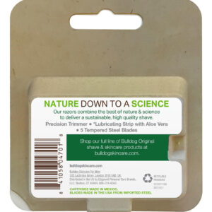 Recargas de lâminas de barbear masculinas Bulldog Mens Skincare and Grooming para homens, 8 unidades — Cada refil de barbear masculino possui 5 lâminas de aço temperado para um barbear próximo e confortável. – Aparador de precisão na parte traseira de cada cartucho para aqueles pontos difíceis e aperfeiçoa seu estilo de pelos faciais. – Faixa de proteção lubrificada enriquecida com óleo de baobá para proteger e acalmar a pele. – Faixa de proteção lubrificada enriquecida com óleo de baobá para proteger e acalmar a pele. – Masculino ecologicamente correto recarga de lâmina de barbear com foco na redução do desperdício e na promoção da sustentabilidade. – O pacote de recargas de lâminas de barbear foi projetado com simplicidade e facilidade de uso, incorporando o Bulldog's abordagem simples de cuidados com a pele.