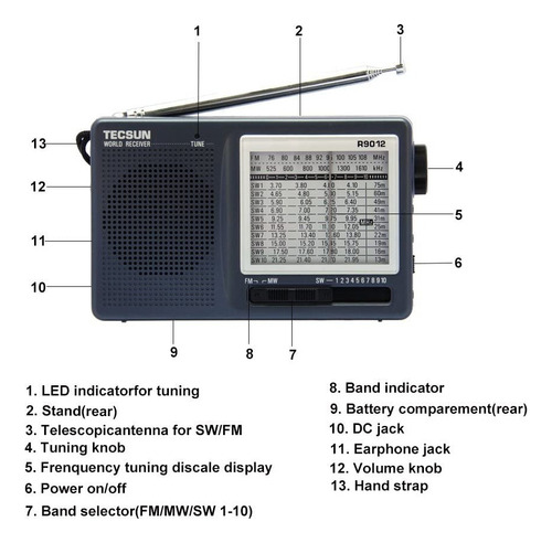 O receptor de rádio de ondas curtas Tecsun R-9012 é um dispositivo portátil que permite sintonizar suas estações favoritas de AM, FM e ondas curtas de forma fácil e conveniente. Com uma banda de frequência AM de 525-1610kHz e uma banda de frequência FM de 76-108MHz, você pode desfrutar de uma ampla variedade de conteúdo de rádio.
