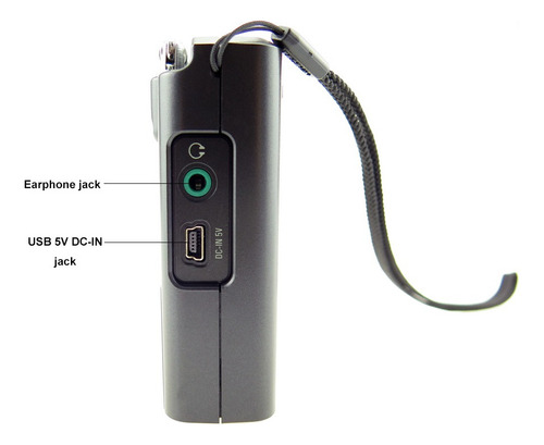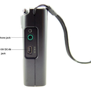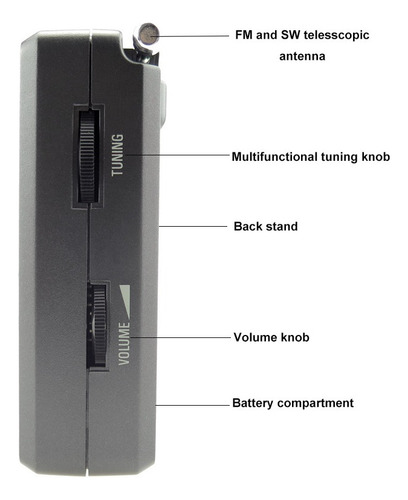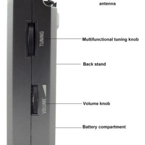 Repetir – Seleção de largura de banda AM – Função de bloqueio do teclado – Suporte traseiro – Conector para fone de ouvido estéreo (3,5 mm) – Conector mini USB 5V DC,