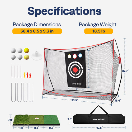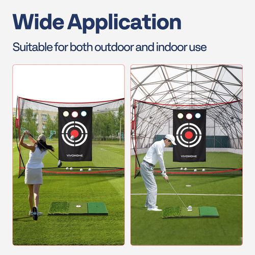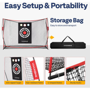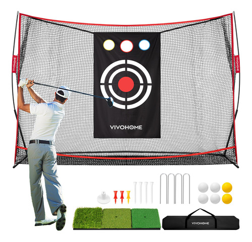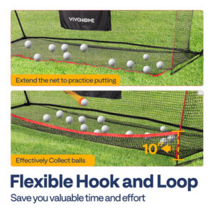 Esta rede pesada de prática de golfe atende às necessidades de jogadores de golfe de todos os níveis que buscam melhorar seu jogo. Seus materiais duráveis resistem a fotos poderosas, enquanto a configuração fácil o torna conveniente para uso em qualquer lugar. Seus acessórios abrangentes permitem que você aproveite o auxílio de treinamento profissional. – Ótima para praticar golfe: esta rede de prática de golfe VIVOHOME foi projetada para ser um auxiliar profissional de treinamento de golfe, permitindo que você aproveite a diversão do treinamento de golfe em qualquer lugar; ela vem com um tecido preto, com um grande alvo multicírculo e 3 alvos pequenos maiores; pode ajudá-lo a manter a memória muscular do swing e melhorar a força e a precisão de lascar, dirigir e balançar; está equipada com 3 tipos de almofadas de grama, 6 bolas de golfe de PU, 7 camisetas de golfe e 1 suporte de borracha – RESISTENTE E DURÁVEL: esta estrutura robusta é feita de hastes de fibra de vidro e uma base de liga de aço, que é de alta resistência para suportar impactos pesados e evitar que a rede de golfe caia; as 4 estacas em forma de U oferecem maior estabilidade e segurança por longos períodos de uso; a grande rede de náilon é forte, espessa e resistente a rasgos, perfeita para golpes poderosos de bola em alta velocidade, enquanto os pontos duplos contribuem para maior durabilidade – EXCELENTE COLEÇÃO DE BOLAS: A rede de treino de golfe de 10 x 7 pés é grande o suficiente para cobrir qualquer chute errôneo; a parte inferior da rede pode pode ser fixado usando gancho e laço para formar um sistema de coleta de bolas, e sua malha elevada pode conter várias bolas, economizando tempo e esforço valiosos, tornando a prática mais eficiente e eficaz; além disso, você pode facilmente estender a rede quando quiser jogar a bola; esse design inovador oferece maior conveniência e versatilidade – FÁCIL MONTAGEM E PORTABILIDADE: projetada para uma configuração rápida, a estrutura pode ser montada em minutos sem a necessidade de ferramentas; a estrutura dobrável e o design leve facilite o armazenamento na bolsa de armazenamento e o transporte para qualquer lugar necessidade – AMPLA APLICAÇÃO: esta versátil rede de prática de golfe é adequada para uso externo e interno, tornando-a um ótimo complemento para seu quintal, jardim, garagem ou porão; esteja ensolarado ou chovendo, você pode praticar suas habilidades de swing sem interrupções; é uma ferramenta essencial para aprimorar a técnica de swing e o desempenho geral, melhorando sua condução e seu jogo curto; ideal para jogadores profissionais, amadores e iniciantes no golfe