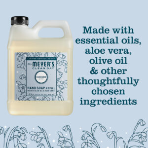 Refil de sabonete líquido para mãos Mrs. Meyer's Clean Day, perfume Snowdrop, frasco de 33 onças – Refil de sabonete Hardworking Snowdrop para mãos ocupadas – Sabonete líquido para mãos feito com óleos essenciais, aloe vera, azeite de oliva e outros ingredientes cuidadosamente escolhidos – Perfume sazonal especial que é fresco e limpo, o Snowdrop apresenta a doçura da laranja e da tangerina misturada com toranja branca e os florais frescos da petúnia gelada – À mão sabonete feito sem parabenos, ftalatos ou cores artificiais – os produtos da Sra. Meyer são feitos com fórmulas livres de crueldade e têm a certificação Leaping Bunny – Sabonete hidratante para mãos que suaviza mãos ocupadas e trabalhadoras