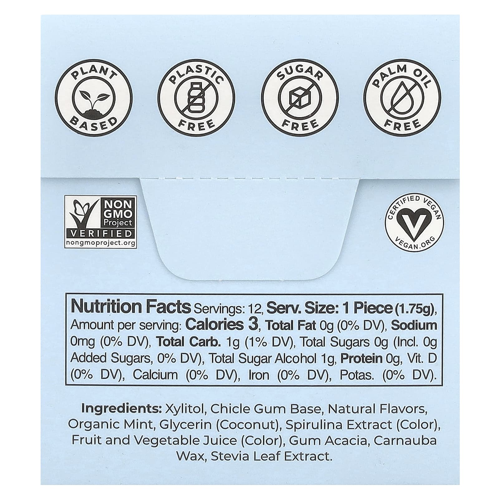 Xilitol, base de goma de chicória, sabores naturais, menta orgânica, glicerina (coco), extrato de espirulina (corante), suco de frutas e vegetais (corante), goma de acácia, cera de carnaúba, extrato da folha de estévia.