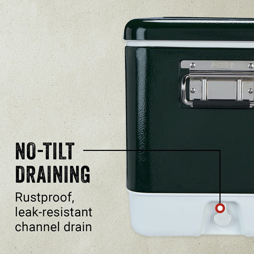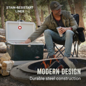 Coleman Cooler Steel-Belted Cooler Keeps Ice Up to 4 Days 54-Quart Cooler for Camping, BBQs, Tailgating & Outdoor Activities – Chic retro design with a high-capacity, heavy-duty build – 54-Quart Capacity Accommodates Up to 85 Cans; Have-a-Seat Lid Supports Up to 250 Pounds – Keeps the Ice insulation offers 4-day ice retention in temperatures as high as 90 degrees Fahrenheit – Made for long term performance with rust-resistant stainless steel hardware – Comfort-grip steel handles for easy, controlled lifting and carrying – Your go-to cooler for Camping, BBQs, Tailgating, Beach Day, Backyard Parties & Outdoor Activities.