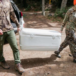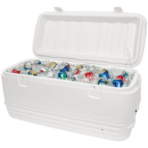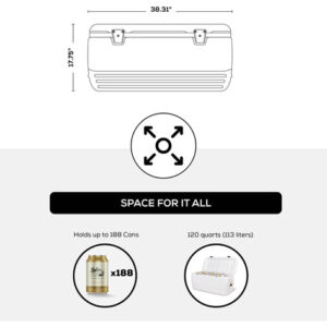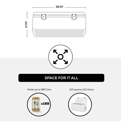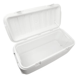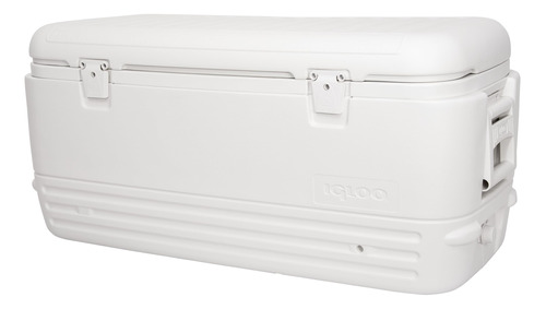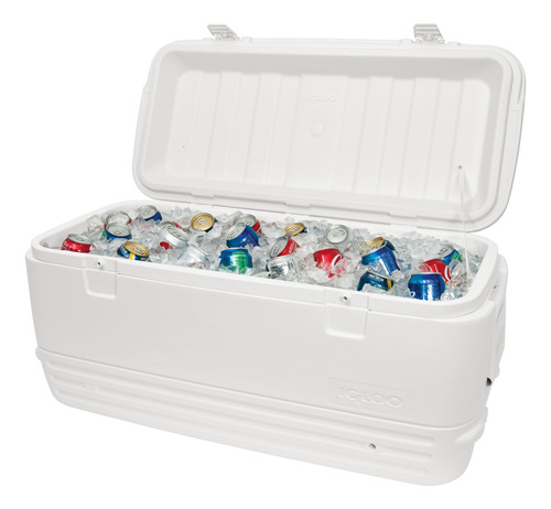 Iglu Polar 120 Qt. Refrigerador – O corpo e a tampa com isolamento ultratérmico mantêm o gelo por 5 dias a 90 graus Fahrenheit – Alças giratórias reforçadas com recurso de amarração – Fecho seguro da tampa – Bujão de drenagem rosqueado para conexão e fácil drenagem da mangueira – Capacidade para 188 latas, dimensões externas 38,31 “L x 17,38" L x 17,75" D. Parte superior – 34,69 x 14,88 x 13,25 polegadas. Parte inferior – 33 x 13,25 x 13,25 polegadas