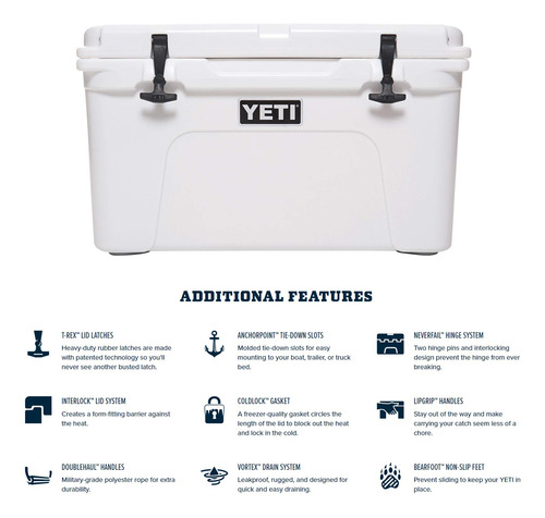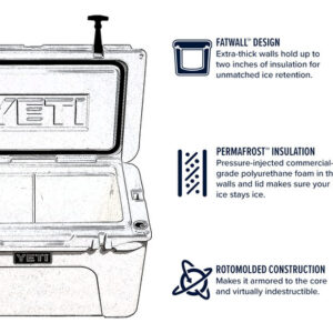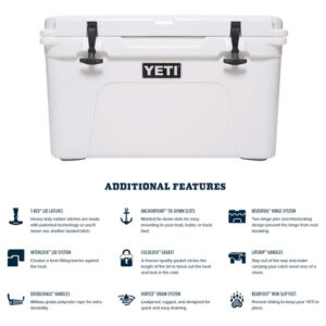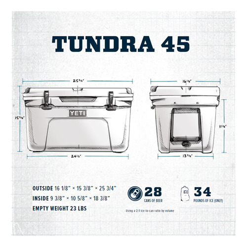 Refrigerador YETI Tundra 45, branco – O YETI Tundra 45 combina versatilidade e durabilidade com uma capacidade de até 26 latas com uma proporção recomendada de 2:1 entre gelo e conteúdo – O gelo permanece no gelo graças a até 3 polegadas de isolamento PermaFrost e um design extra espesso de FatWall é certificado como resistente a ursos – A construção rotomoldada torna a tundra blindada até o núcleo e praticamente indestrutível onde quer que você decida levá-lo, a construção robusta deste refrigerador portátil resistirá aos rigores da viagem – Todos os refrigeradores Tundra possuem travas de tampa T-Rex construídas em borracha resistente para que você nunca veja outra trava quebrada e possui tecnologia de proteção patenteada – as dimensões do Tundra 45 são 25 3/4 de comprimento x 16 1/8 de largura x 15 3/8 de altura com um peso vazio de 23 libras NOTA: Todos os modelos Tundra vêm de fábrica com uma cesta de produtos secos.
