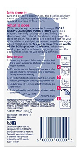 Remova os cravos e reduza o tamanho dos poros com Bioré Blackhead reduzindo a faixa de poros de limpeza profunda. Essas tiras profundas de nariz de limpeza têm como alvo cravos e poros desentupidos para uma pele saudável. Convenientes e fáceis de usar, estas Pore Strips podem ser usadas 1x por semana para a limpeza mais profunda. Ao contrário de outras ‘tiras de poros’ aspirantes, as tiras de poros de limpeza profunda da Bioré usam tecnologia patenteada de C-bond para se ligar a cravos e impurezas, NÃO à pele. Estas tiras da Kao USA são super magnéticas para remover com segurança e eficácia sujeira, óleo e até mesmo cravos teimosos. Bioré Deep Cleansing Pore Strips deixam a pele mais limpa com poros visivelmente menores após uso contínuo. Uma maneira dermatologista testada para remover cravos e purificar poros. Satisfação garantida. Limitações podem ser aplicadas.
