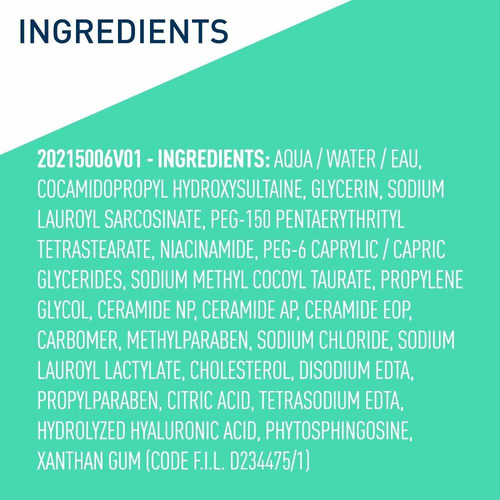 Limpador facial em espuma CeraVe | Sabonete facial diário para pele oleosa com ácido hialurônico, ceramidas e niacinamida | Sem perfume, sem parabenos | 16 onças fluidas – [LIMPADOR FACIAL ESPUMANTE] Dispensa como um limpador de gel transparente e se transforma em espuma à medida que você ensaboa. Limpa sem deixar a pele esticada, seca ou despojada – [LIMPADOR DE ROSTO QUE NÃO SECA] Sem perfume, sem parabenos, não comedogênico, não resseca e não irritante. Refresca suavemente e remove com eficácia o excesso de óleo, sujeira e maquiagem – [CUIDADOS COM A PELE MULTIUSO] Limpador de pele para rosto e/ou corpo e pode ser usado como um sabonete à mão. Adequadas para limpeza diária de manhã (manhã) e noite (à noite) para peles normais a oleosas – [3 CERAMIDAS ESSENCIAIS] As ceramidas são encontradas naturalmente na pele e compõem 50% dos lipídios na barreira cutânea. Todos os produtos CeraVe, formulados com três ceramidas essenciais (1, 3, 6-II) para ajudar a manter a barreira natural da pele. – [DESENVOLVIDO COM DERMATOLOGISTAS E MARCA #1 RECOMENDADA POR DERMATOLOGISTAS] O CeraVe Skincare é desenvolvido com dermatologistas e tem produtos adequados para pele seca, pele sensível, pele oleosa, propensa a acne e muito mais.
