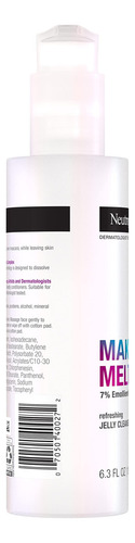 Derreta a maquiagem enquanto deixa a pele macia e limpa com o limpador de geleia refrescante Neutrogena Makeup Melting. Este removedor de maquiagem suave e eficaz de uma marca recomendada por dermatologistas derrete facilmente a maquiagem teimosa dos olhos, rosto e lábios sem descascar ou ressecar a pele. Desenvolvido com dermatologistas e maquiadores, o limpador de geleia dissolvente de maquiagem sem óleo remove a maquiagem persistente e contém 7% do complexo de vitaminas emolientes da Neutrogena, com patente pendente, e condicionadores de pele para ajudar a deixar a pele macia. O limpador facial com pH balanceado é testado por oftalmologistas e adequado para a delicada área dos olhos. Também não contém sabão, parabenos, ftalatos, álcool, óleo mineral e corantes. Para obter melhores resultados, aplique o limpador condicionador de pele na pele seca e massageie suavemente. Para remover, enxágue com água ou limpe com uma almofada de algodão.