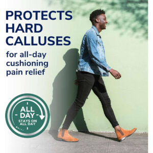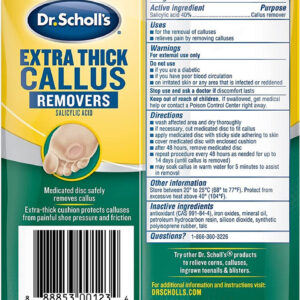 A almofada extra grossa protege os calos da dolorosa pressão e fricção do calçado. — Projetada para permanecer no calçado o dia todo — Amortecimento extra macio — Discos medicamentosos