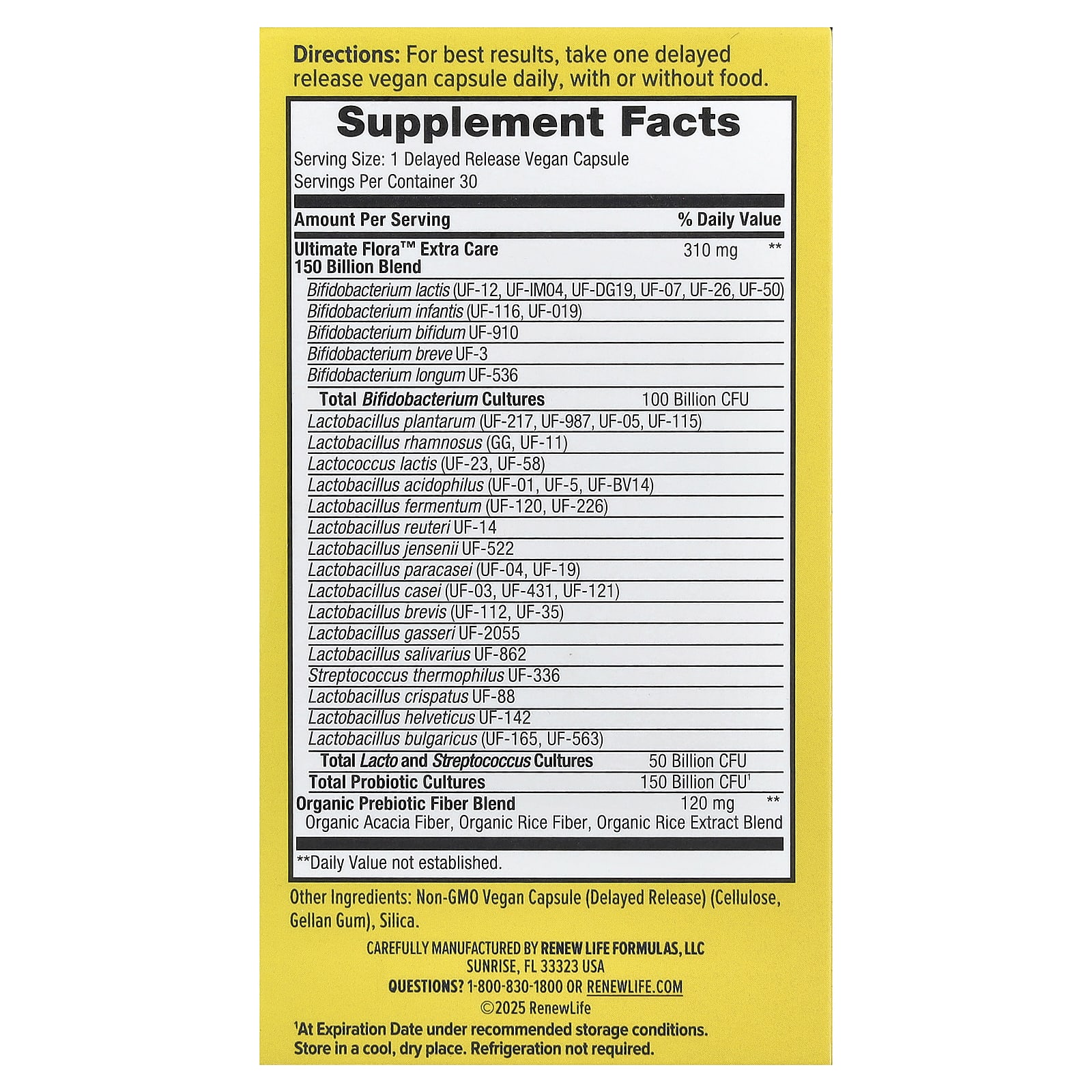 Renew Life Extra Care Probiótico Ultimate Flora™ 30 Cápsulas Veganas de Liberação Retardada – Renew Life Suplementos Saúde Intestinal Probióticos.