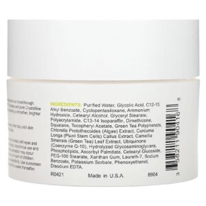Água purificada, ácido glicólico, c12-15 alkyl benzoate, decametilciclopentasiloxano, hidróxido de amônio, álcool cetoestearílico, monoestearato de glicerila, poliacrilamida, isoparafina c13-14, dimeticona, esqualano, acetato de tocoferol, polifenóis do chá verde, extrato de Chlorella protothecoides (algas), extrato de calosidade de Curcuma longa (células-tronco vegetais), extrato da folha de Camellia sinensis (chá verde), ubiquinona (coenzima Q-10), hydrolyzed glycosaminoglycans, fosfolipídeos, palmitato de ascorbila, glicopiranosídeo cetoestearílico, estearato de PEG-100, goma xantana, laureth-7, benzoato de sódio, sorbato de potássio, fenoxietanol, edetato dissódico.