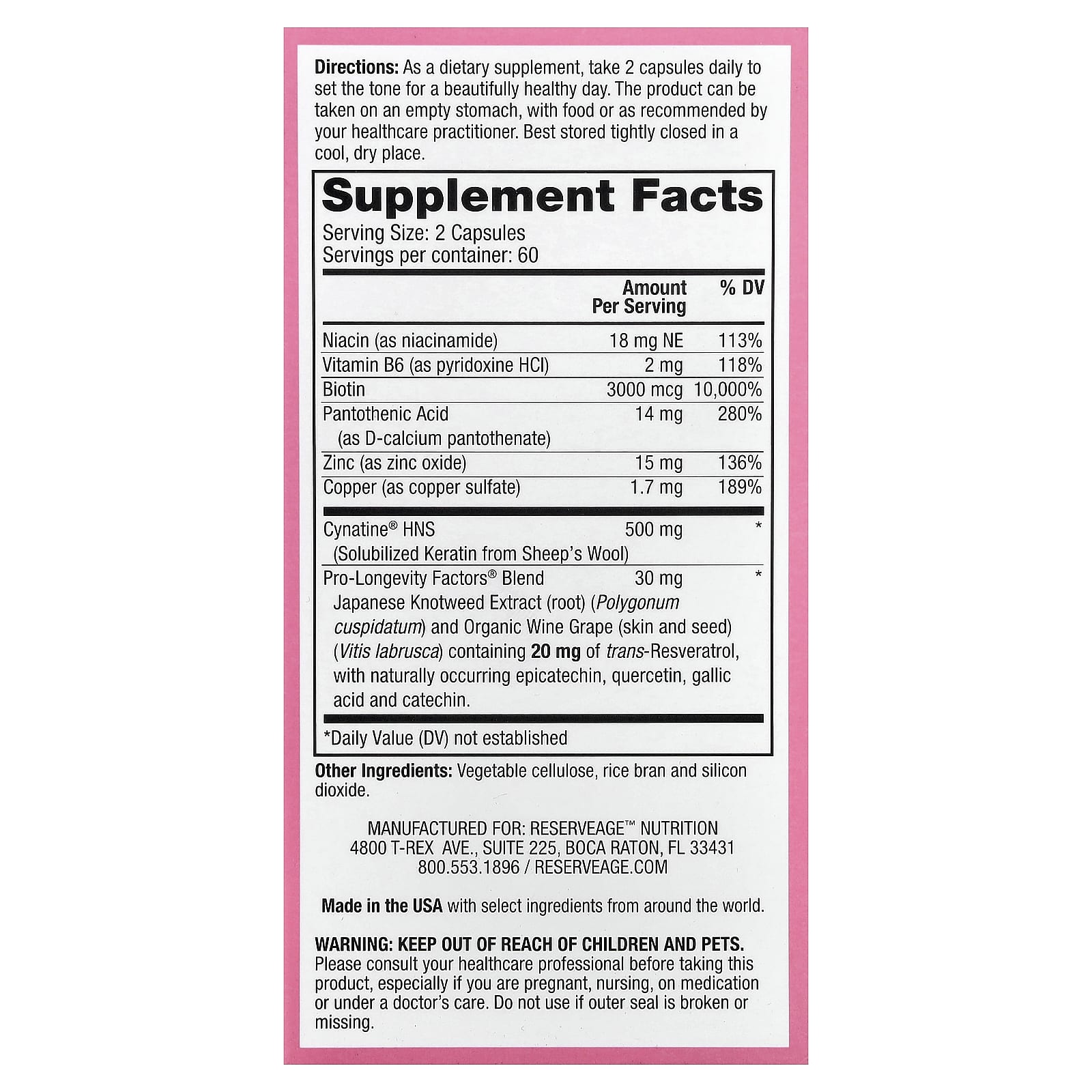 Reserveage Beauty Reforço de Queratina Capilar com Biotina e Resveratrol 120 Cápsulas – Reserveage Beauty Suplementos Cabelos, Pele e Unhas Fórmulas para cabelos, pele e unhas.