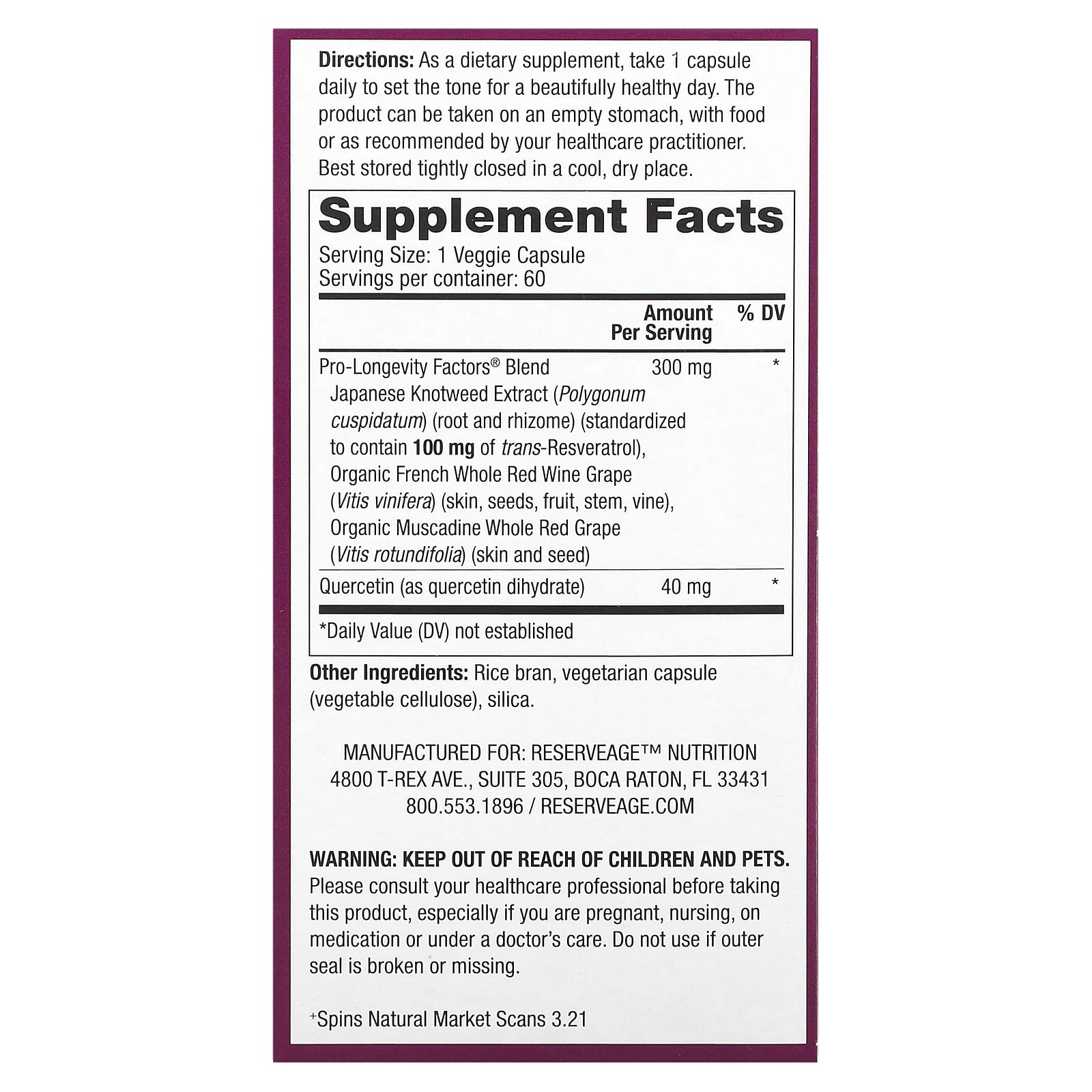 Reserveage Beauty Resveratrol 100 mg 60 Veggie Capsules – Reserveage Beauty Suplementos Antioxidantes Resveratrol.