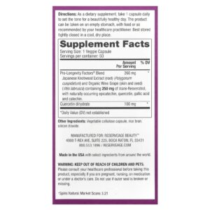 | Mistura Pro-Longevity Factors® Extrato de Reynoutria japonica (raiz) (Polygonum cuspidatum) e Uva para Vinho Orgânica (casca e semente) (Vitis labrusca) contendo 250 mg de trans-resveratrol, com epicatechin, quercetina, ácido glicólico e catequina de ocorrência natural. |