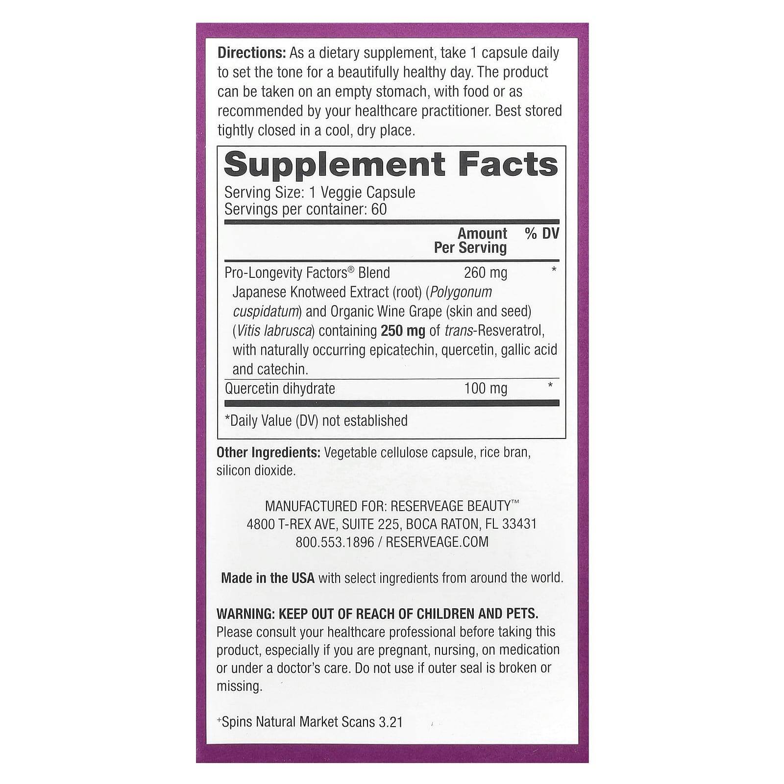 Reserveage Beauty Resveratrol Trans-Resveratrol 60 Cápsulas Vegetais – Reserveage Beauty Suplementos Antioxidantes Resveratrol Trans-Resveratrol.