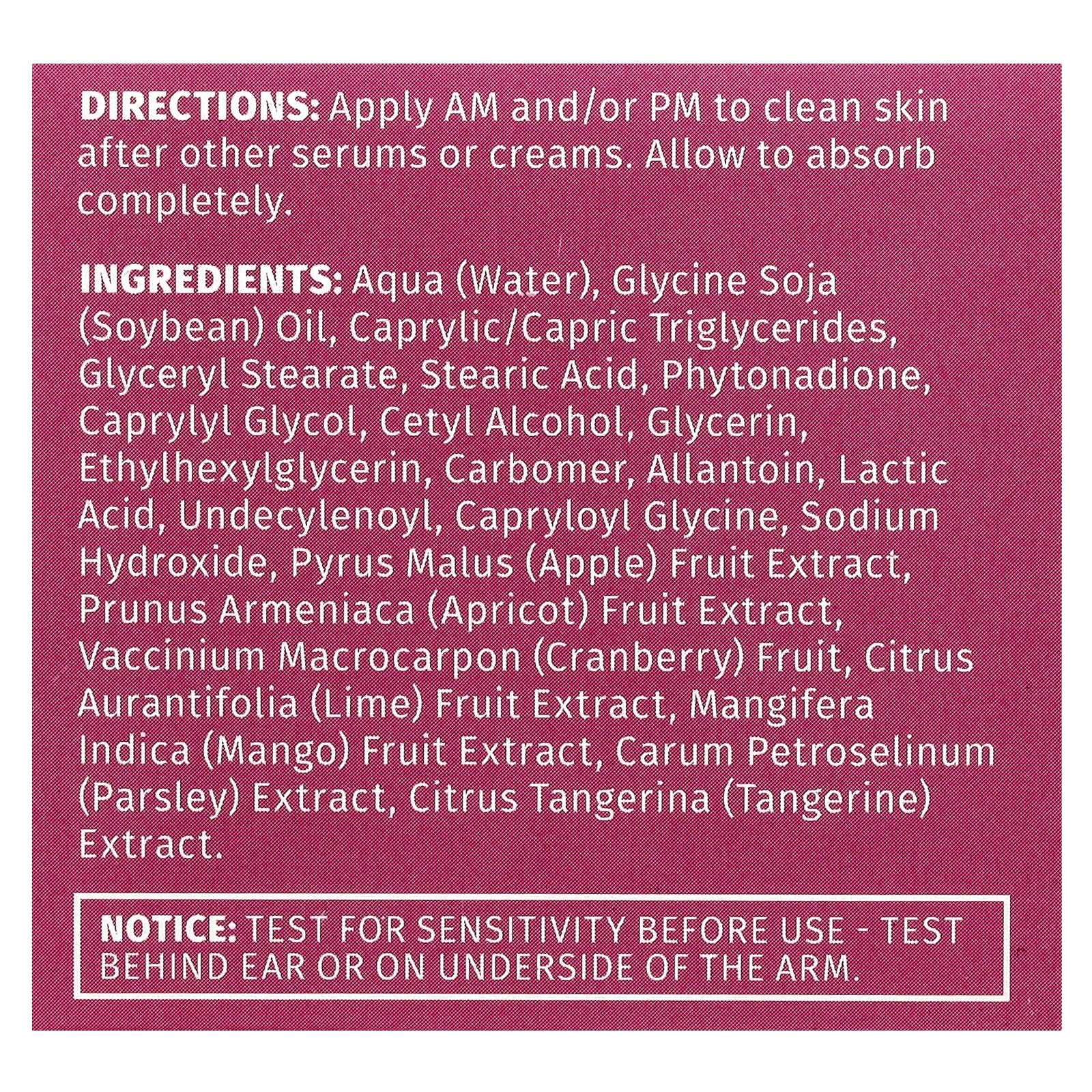 Água, óleo de Glycine soja (soja), caprylic/capric triglycerides, monoestearato de glicerila, ácido esteárico, fitomenadiona (vitamina K), caprylyl glycol, álcool cetílico, glicerina, ethylhexylglycerin, carbômero, alantoína, ácido láctico, undecilenoil, capryloylglycine, hidróxido de sódio, extrato da fruta de Pyrus malus (maçã), extrato da fruta de Prunus armeniaca (damasco), extrato da fruta de Vaccinium macrocarpon (cranberry), extrato da fruta de Citrus aurantifolia (limão-taiti), extrato da fruta de Mangifera indica (manga), extrato de Carum petroselinum (salsa), extrato de Citrus tangerina (tangerina).