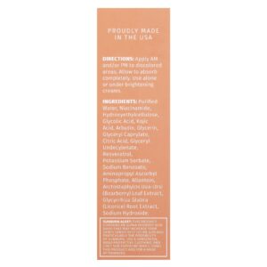 Água purificada, nicotinamida, hietelose, ácido glicólico, ácido kojic, arbutin, glicerina, caprilato de glicerila, ácido cítrico, glyceryl undecylenate, resveratrol, sorbato de potássio, benzoato de sódio, aminopropyl ascorbyl phosphate, alantoína, extrato da folha de Arctostaphylos uva-ursi (bearberry), extrato da raiz de Glycyrrhiza glabra (alcaçuz), hidróxido de sódio.