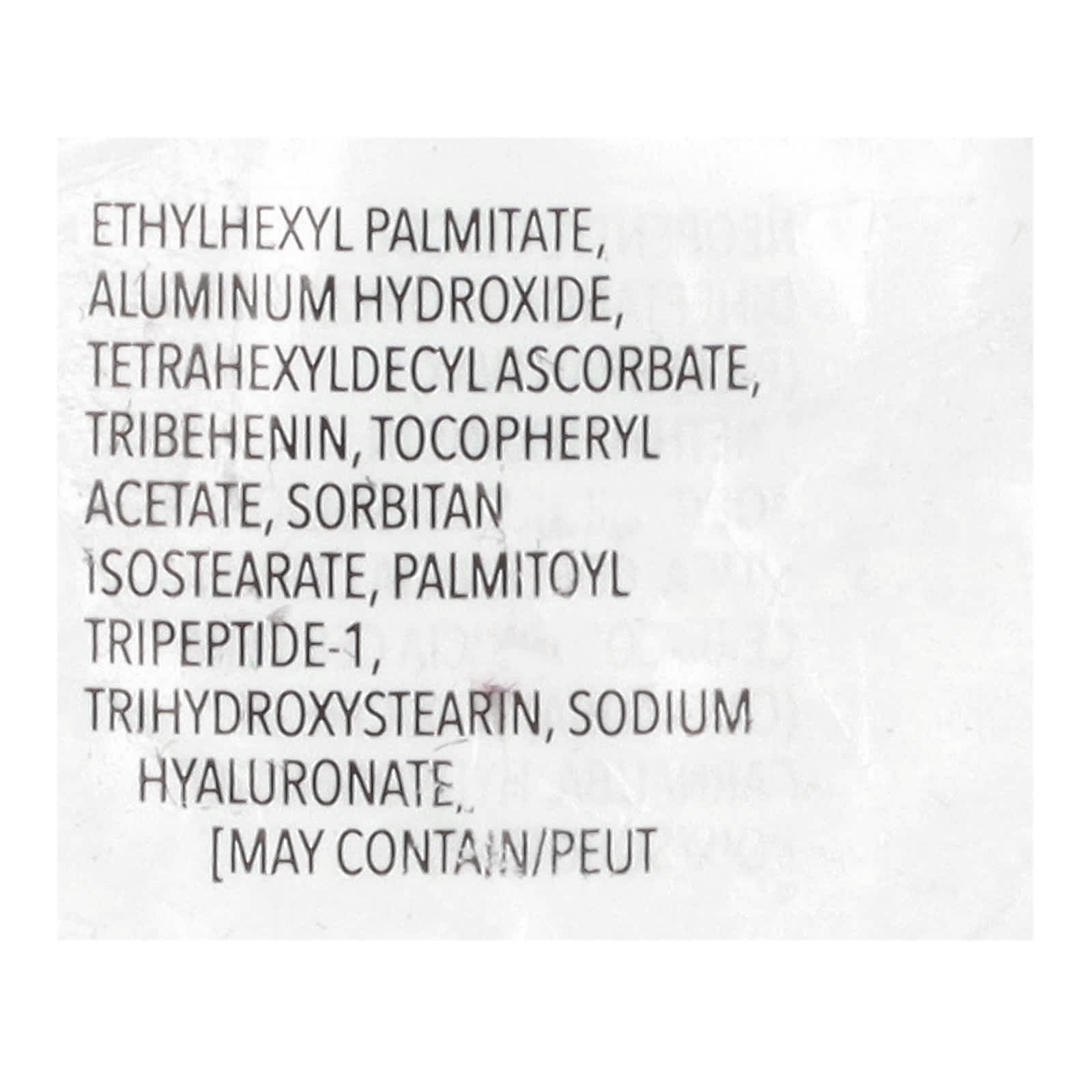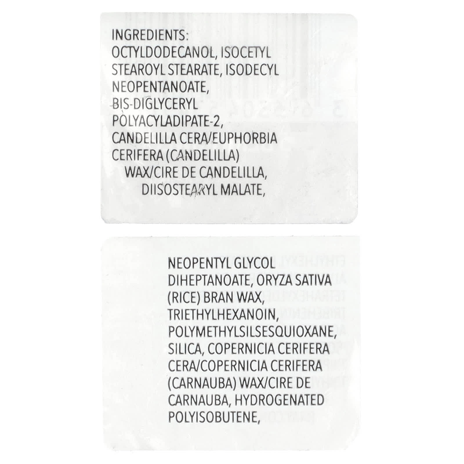 Octildodecanol, estearato de isocetil estearoil, neopentanoato de isodecila, bis-diglyceryl polyacyladipate-2, cera de Euphorbia cerifera (candelila), diisostearyl malate, neopentyl glycol diheptanoate, cera do farelo de Oryza sativa (arroz), triethylhexanoin, polymethylsilsesquioxane, sílica, cera de Copernicia cerifera (carnaúba), poliisobuteno hidrogenado, ethylhexyl palmitate, hidróxido de alumínio, tetrahexidecil ascorbato, tribohenin, acetato de tocoferol, isoestearato de sorbitana, palmitoyl tripeptide-1 trihydroxystearin, hialuronato de sódio [pode conter/peut contenir/+/-: amarelo crepúsculo laca de alumínio (CI 19140), dióxido de titânio (CI 77891), vermelho 7 laca de cálcio (CI 15850), óxidos de ferro (CI 77491, CI 77492, CI 77499), azul brilhante laca de alumínio (CI 42090), vermelho 27 laca de alumínio (CI 45410)].