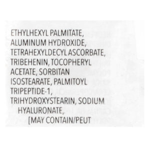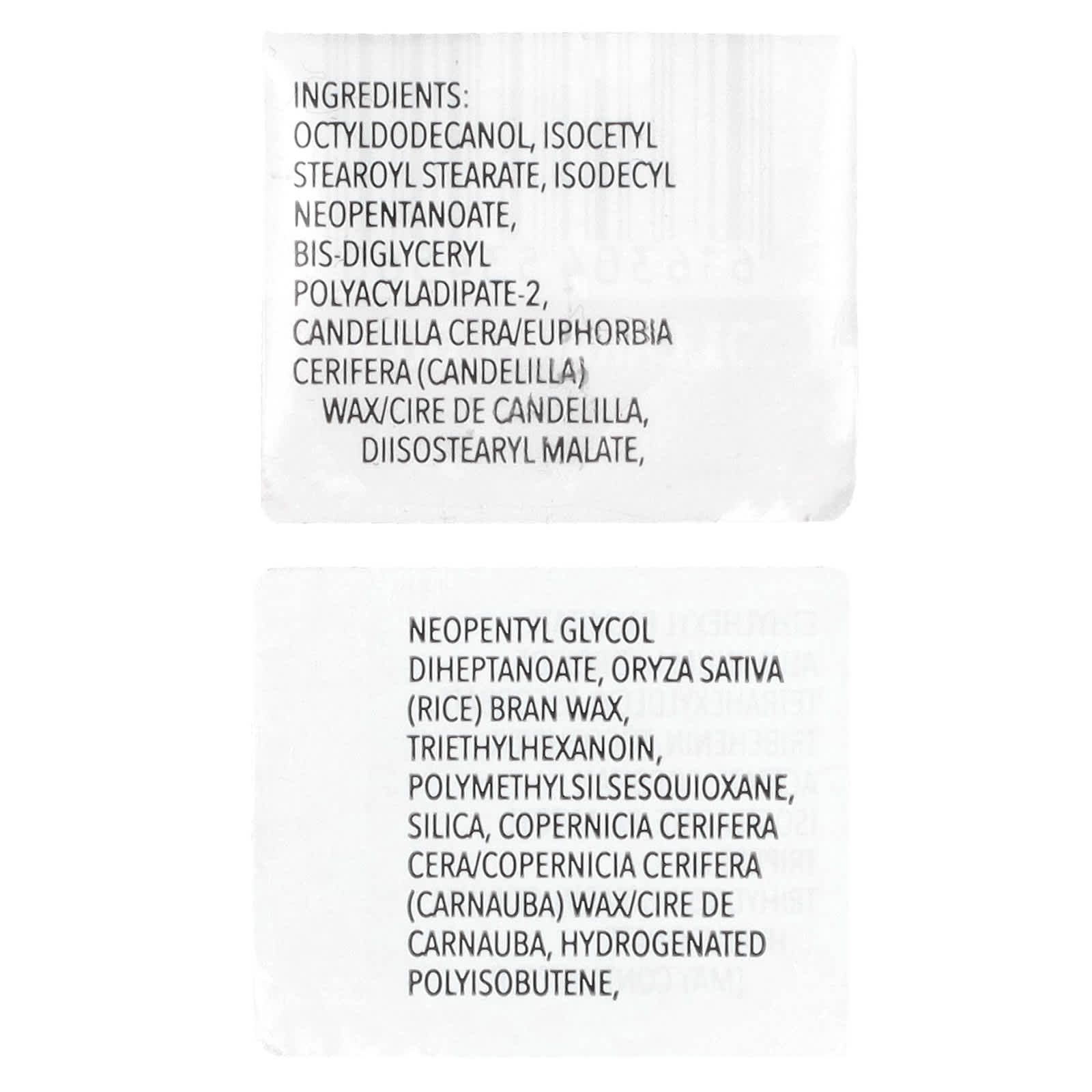 Octildodecanol, estearato de isocetil estearoil, neopentanoato de isodecila, bis-diglyceryl polyacyladipate-2, cera de candelila/cera de Euphorbia cerifera (candelila), diisostearyl malate, neopentyl glycol diheptanoate, cera do farelo de Oryza sativa (arroz), triethylhexanoin, polymethylsilsesquioxane, sílica, cera de Copernicia cerifera (carnaúba), poliisobuteno hidrogenado, ethylhexyl palmitate, hidróxido de alumínio, tetrahexidecil ascorbato, tribohenin, acetato de tocoferol, isoestearato de sorbitana, palmitoyl tripeptide-1, trihydroxystearin, hialuronato de sódio, [pode conter/+/-: amarelo crepúsculo laca de alumínio (CI 19140), dióxido de titânio (CI 77891), vermelho 7 laca de cálcio (CI 15850), óxidos de ferro (CI 77491, CI 77492, CI 77499), azul brilhante laca de alumínio (CI 42090), vermelho 27 laca de alumínio (CI 45410)].