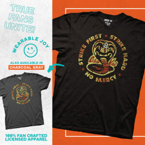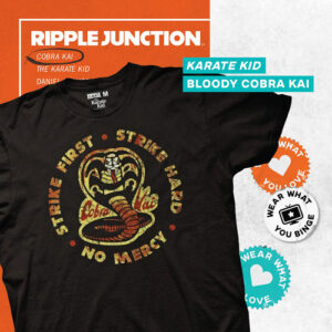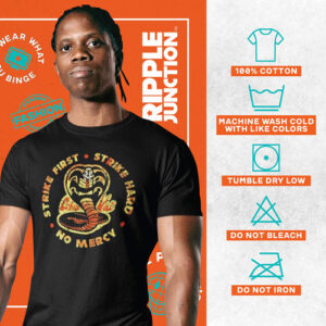 Here at Ripple Junction, we are fans first. Were obsessed with bringing fandom and fashion together. In fact, its kind of our whole deal. We love nothing more than geeking out over fun novelty apparel and accessories while spreading positivity. Two dudes in a van started our scene, and we have kept it going with the same fandom vibes only from, you know, a building. No matter where our clothes are made, they are all designed with the same care and attention to detail. We are all about spreading positivity and togetherness. Fandoms unite people in a unique and entertaining way that we live for, and we plan to keep that vision alive. No matter what fandoms you are interested in, already a part of, or even the ones you dont know you love yet, we have you covered, literally. We are inclusive and welcoming to all, and we will keep it that way. Ripple Junction puts fans first! After all, where would fandoms be without their ride or die? Geek out and have fun representing your favorite fandoms while also expressing yourself. Our products make great conversation starters, so you might even make a new friend or two! – SENSEI APPROVED: 100% Officially licensed apparel by Cobra Kai. This vintage Cobra Kai graphic printed tee was designed in-house and manufactured to meet the high creative and quality standards required to receive the exclusive seal of approval for officially licensed products bearing the Cobra Kai name. – STRIKE FIRST, STRIKE HARD, NO MERCY: No matter which karate dojo is your favorite from the nostalgic reboot, this tee featuring the Cobra Kai dojo logo and slogan is sure to be a go to staple in your apparel collection. No Cobra Kai apparel compilation is complete without this distressed logo and motto T-shirt! – COBRA KAI MERCH FOR ALL FANS: This timelessly cool crew-neck shirt is available in sizes S5XL. Chest measurements in inches: S (18), M (20), L (22), XL (24), 2XL (26), 3XL (28), 4XL (30), and 5XL (32). Check out our size chart to ensure a perfect fit every time! – CLASSIC NOSTALGIA MEETS MODERN TREND: Whether you are sitting at home watching your favorite 80s flicks or training for the All Valley Karate Tournament, this cool and comfortable Cobra Kai tee is sure to become a quick favorite. – CLOTHING FOR FANS, BY FANS: Here at Ripple Junction, we strive to blend our unique design appeal with the iconic images, logos, and memories that defined a generation. Cobra Kai brought new life to The Karate Kid franchise and its fans when the series debuted. We want to take you back to that feeling when you put on this Ripple Junction product.