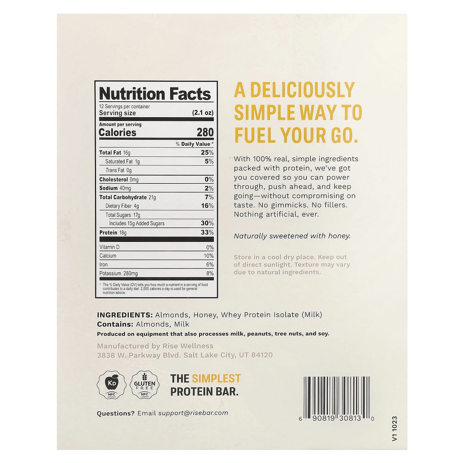 Rise Bar Barra de Proteína Amêndoa e Mel 12 Barras 60 g (21 oz) Cada – Rise Bar Nutrição Esportiva Barrinhas e snacks esportivos Barras de Proteína Barras de Proteína de Whey.