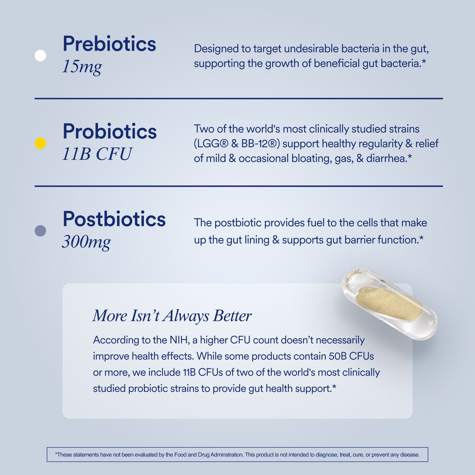 Prebióticos, probióticos e pós-bióticos 3 em 1 clinicamente estudados para promover um microbioma intestinal equilibrado.