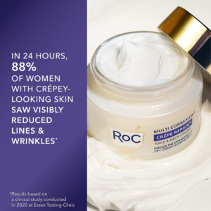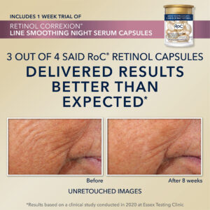 RoC Crepe Repair Anti Aging Daily Face Moisturizer & Neck Firming Cream (1.7 oz) + RoC Retinol Wrinkle Smoothing Capsules (7 CT), Skin Care Routine for Women and Men – CREPEY SKIN TREATMENT: This potent cream with glycerin and antioxidants works to instantly plump & fill creases to visibly smooth hard-to-treat crepey skin on the face, neck and decolletage. Over time, it visibly reduces sagging for a more defined, contoured appearance where skin was noticeably looser. – PROVEN RESULTS: With a powerful blend of our unique Hexyl-R Complex & Moisturizing Extracts this rich cream instantly hydrates and smooths dry, crpey skin, plumping creases, and filling out lines & wrinkles. – ANTI-AGING FORMULAS: Whether youre looking for a solution for deep wrinkles, fine lines, dark circles, crows feet, uneven skin tone or dry skin, we have an anti-aging formula thats right for you. – SCIENCE & BEAUTY: We produce a wide array of skin care products & treatments including daily moisturizers with SPF, hyaluronic and niacinamide acids, facial cleansers, vitamin C serums, retinol skin tone & wrinkle regimens & creams for under eyes, neck firming, decollete & much more. – SKIN CARE INNOVATION: Our products are recognized by beauty industry leaders & dermatologists for their best-in-class effectiveness. We continue to research & innovate new formulas for healthier skin.