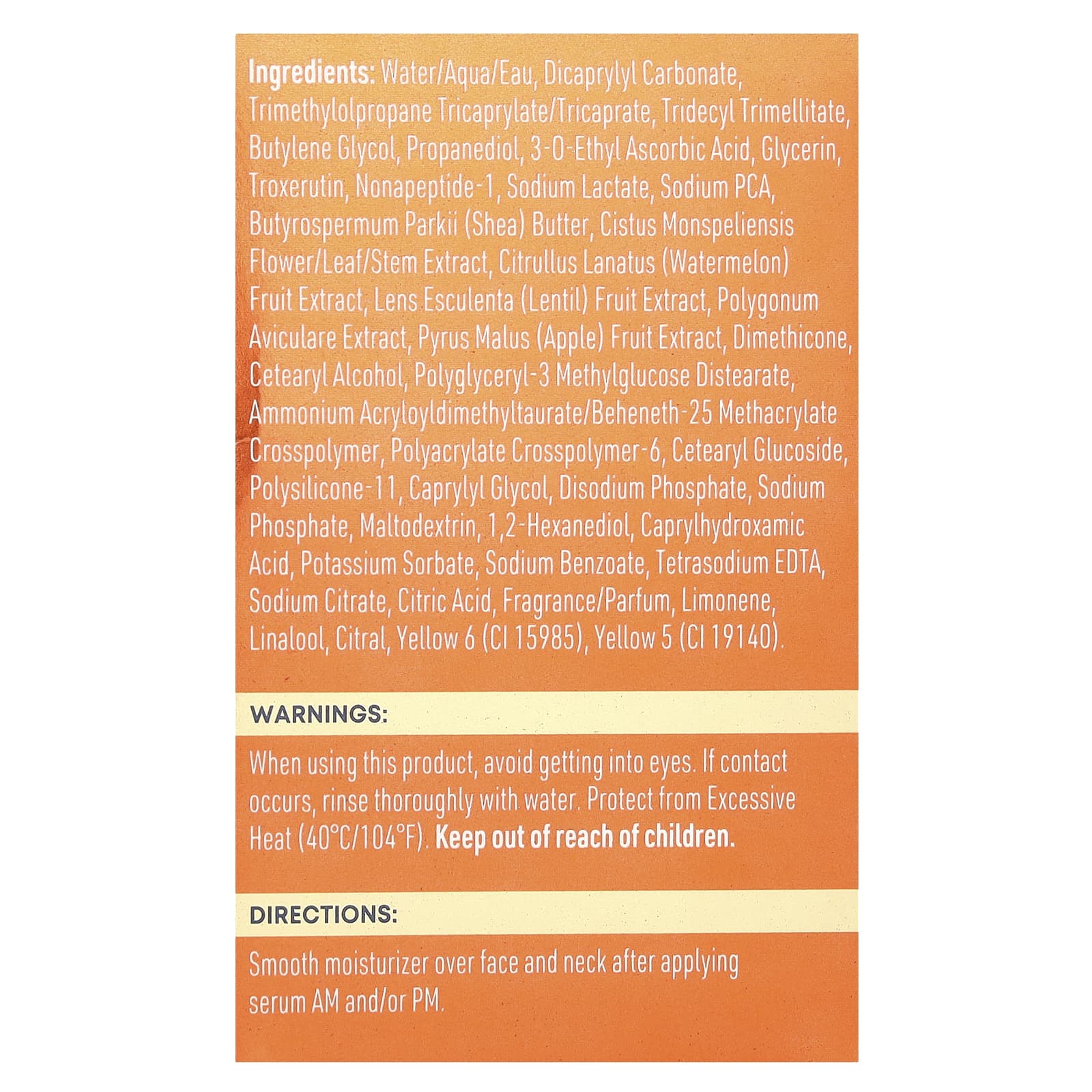 Água, carbonato de dicaprililo, trimethylolpropane tricaprylate/tricaprate, tridecil trimelitato, butylene glycol, propanediol, 3-0-ethyl ascorbic acid, glicerina, troxerutina, nonapeptide-1, lactato de sódio, pidolato de sódio, manteiga de Butyrospermum parkii (karité), extrato da flor/folha/caule de Cistus monspeliensis, extrato da fruta de Citrullus lanatus (melancia), extrato da fruta de Lens esculenta (lentilha), extrato de Polygonum aviculare, extrato da fruta de Pyrus malus (maçã), dimeticona, álcool cetoestearílico, polyglyceryl-3 methylglucose distearate, ammonium acryloyldimethyltaurate/beheneth-25 methacrylate crosspolymer, polyacrylate crosspolymer-6, glicopiranosídeo cetoestearílico, polissilicone-11, caprylyl glycol, fosfato dissódico, fosfato de sódio, maltodextrina, 1,2-hexanediol, caprylhydroxamic acid, sorbato de potássio, benzoato de sódio, EDTA tetrassódico, citrato de sódio, ácido cítrico, fragrância/perfume, limoneno, linalol, citral, amarelo crepúsculo (CI 15985), tartrazina (CI 19140).