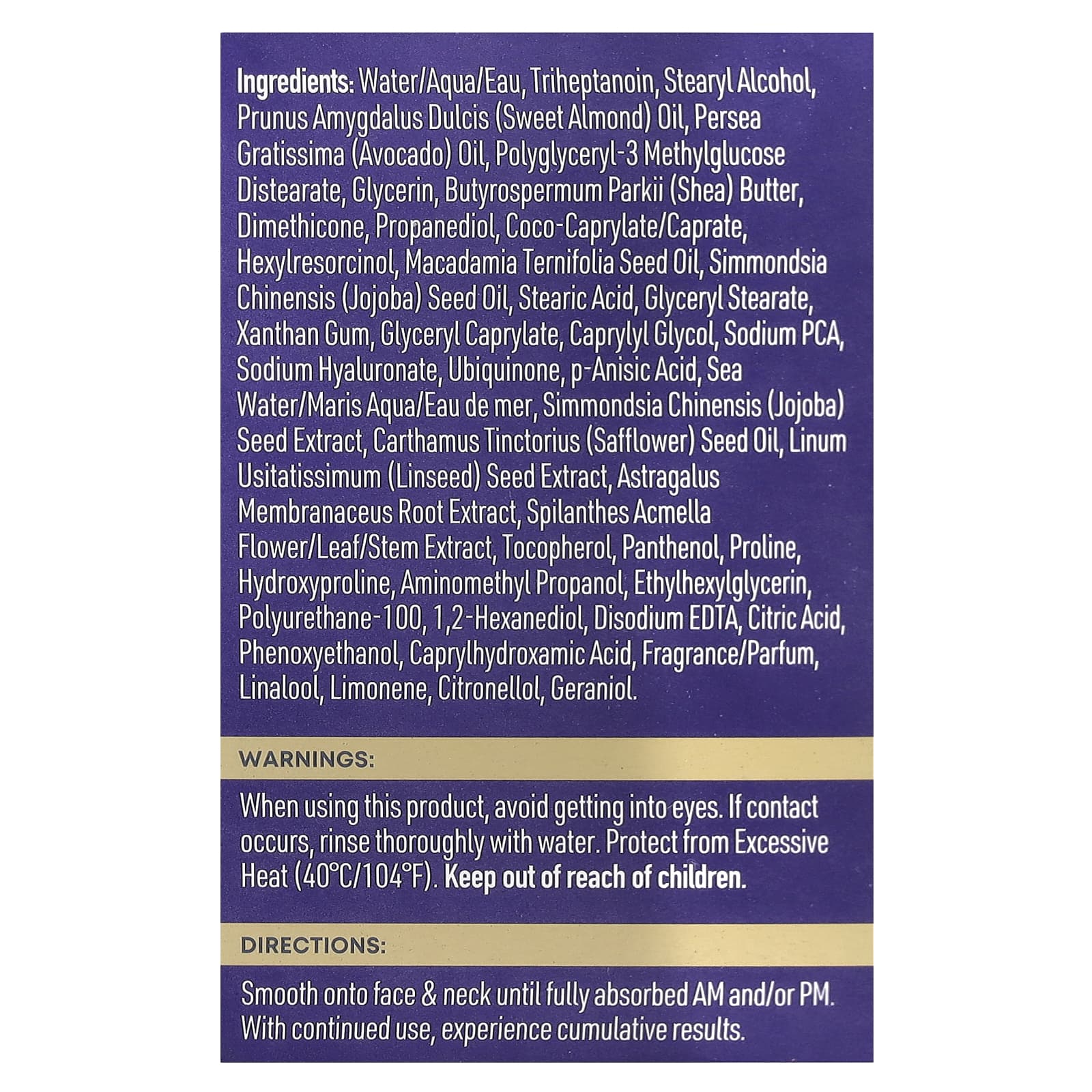 Água/aqua/eau, triheptanoin, álcool estearílico, óleo de Prunus amygdalus dulcis (amêndoa doce), óleo de Persea gratissima (abacate), polyglyceryl-3 methylglucose distearate, glicerina, manteiga de Butyrospermum parkii (karité), dimeticona, propanediol, coco-caprylate/caprate, hexilresorcinol, óleo da semente de Macadamia ternifolia, óleo da semente de Simmondsia chinensis (jojoba), ácido esteárico, monoestearato de glicerila, goma xantana, caprilato de glicerila, caprylyl glycol, sódio p hialuronato de sódio, ubiquinona, ácido p-anísico, água do mar/Maris aqua/eau de mer, Simmondsia chinensis (extrato da semente de jojob, óleo da semente de Carthamus tinctorius (cártamo), extrato da semente de Lin usitatissimum (linhaça), extrato da raiz de Astragalus membranaceus, extrato da flor/folha/caule de Spilanthes acmella, tocoferol, pantenol, prolina, hidroxiprolina, aminometil propanol, ethylhexylglycerin, poliuretano-100,1,2-hexanediol, edetato dissódico, fenoxietanol de ácido cítrico, caprylhydroxamic acid, fragrância/perfume linalol, limoneno, citronelol, geraniol.