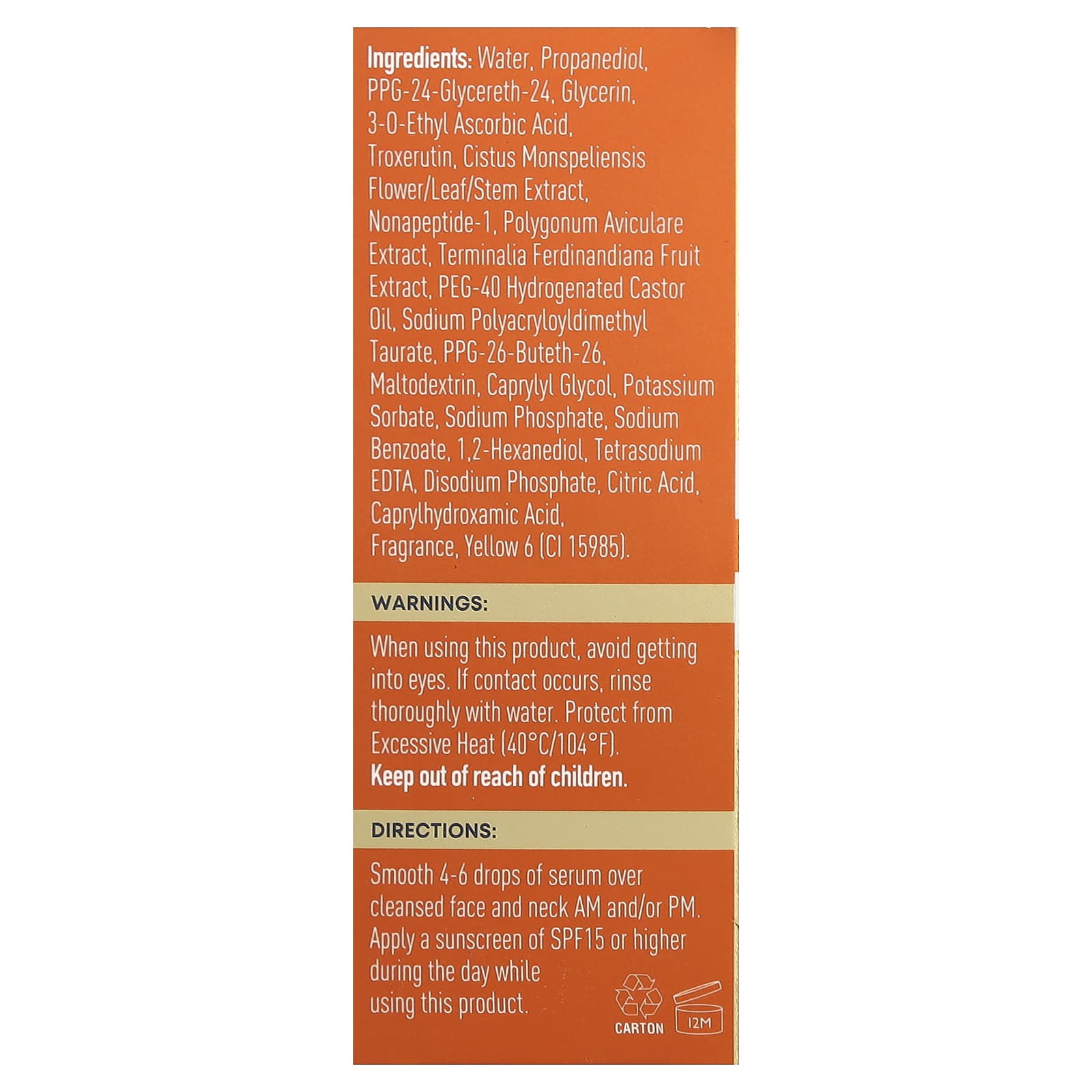 Água, propanodiol, ppg-24-glycereth-24, Glicerina, Ácido 3-0-etil ascórbico, tropicrutina, extrato de flor/folha/caule de Cistus monspeliensis, nonapeptídeo-1, extrato de Polygonum aviculare, extrato da fruta de Terminalia ferdinandiana, Óleo de rícino hidrogenado PEG-40, sodium polyacryloyldimethyl taurate, ppg-26-buteth-26, Maltodextrina, caprilil glicol, Sorbato de potássio, fosfato de sódio, benzoato de sódio, 1,2-hexanodiol, EDTA tetrassódico, fosfato dissódico, ácido cítrico, caprylhydroxamic acid, fragrância, amarelo crepúsculo (CI 15985).