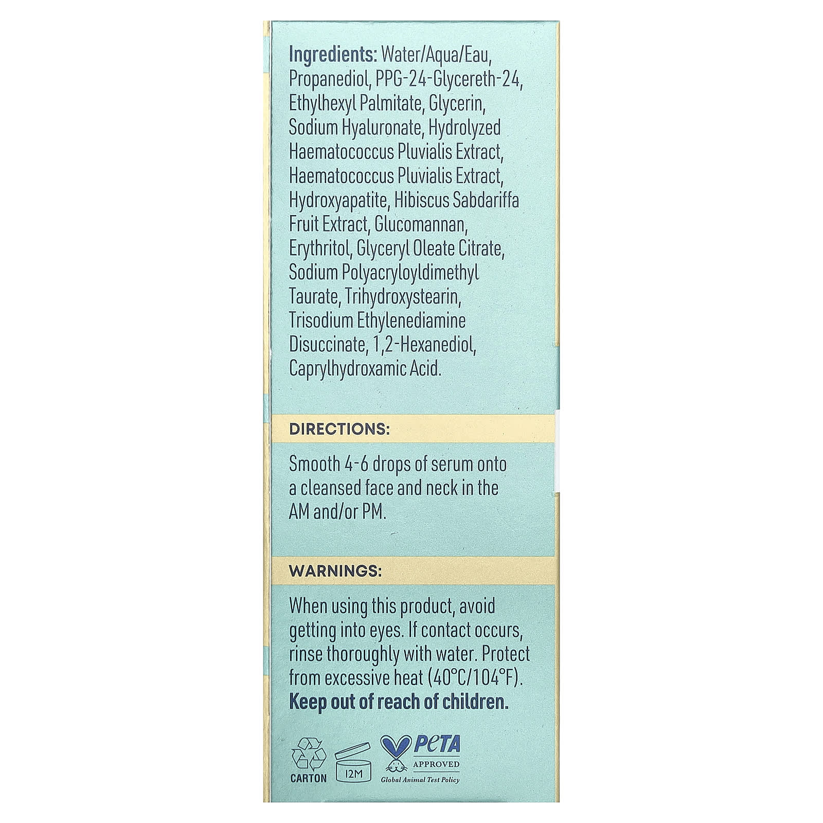 Água/aqua/eau, propanodiol, ppg-24-glycereth-24, ethylhexyl palmitate, Glicerina, hialuronato de sódio, extrato de Haematococcus pluvialis hidrolisado, extrato de Haematococcus pluvialis, hidroxiapatita, extrato da fruta de Hibiscus sabdariffa, glucomannan, eritritol, citrato de monoleato de glicerila, sodium polyacryloyldimethyl taurate, trihydroxystearin, disuccinato de etilenodiamina trissódica, 1,2-hexanodiol, caprylhydroxamic acid.