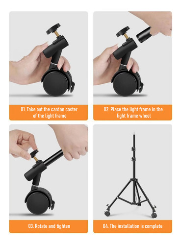 luz Características: Conjunto de rodízios de suporte de luz: Os rodízios de suporte de luz são adequados para a maioria dos suportes de luz fotográficos cujos pés têm um diâmetro de 16 mm. Bible de usar: As rodas leves são feitas de ABS, que tem alta dureza, durabilidade e longa vida útil. Rotativo em 360 graus: as rodas leves suportam rotação de 360° e se movem suavemente, sem ruídos e marcas de arrasto . Seguro e confiável: com sistema de trava para travar e soltar as rodas, o que pode garantir a qualidade de seu equipamento gráfico. Especificações: Metal &,43; Diâmetro do orifício de montagem em ABS: 16 mm Lista de pacotes: 3 * rodas giratórias
