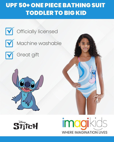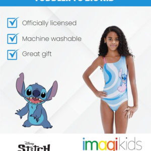 Join Lilo and her koala-like pet dog Stitch on their latest fun adventures in Hawaii and outer space. In this Lilo and Stitch One Piece Bathing Suit help save Experiment 626 from the Galactic Federation and learn with Nani, Lilo, and Stitch that Ohana means family. Featuring your kids favorite animated Disney characters, this cute and stylish one piece swimming suit will become an everyday favorite. – 85% Polyester , 15% Spandex – Officially licensed Disney little girls cute and stylish one piece swimming suit – All over print design; Awesome sublimation print design; UPF 50+ material for UVB and UVA protection and worry-free sun time; 4 way stretch fabric for comfort and long-lasting fit; Asymmetrical top neckline; Spaghetti straps; Fully lined; Pull on closure – Stylish kids bathing suit with a comfortable fit and easy-to-dress design that is a durable summer essential; youth fashion swimwear made from material that protects your child from the sun and is safe on skin – Quick drying childrens one-piece swimsuit with cute and fun character designs that your active little girl cant wait to wear in the water at the beach or pool – Perfect for birthday gift, warm summer days, outdoor play, swimming at the pool and beach and playing in the sun, sand and water