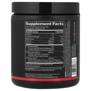 Uma combinação de creatina, eletrólitos e cafeína de extratos de chá, café, guaraná e erva-mate elaborada para promover desempenho de alta intensidade, energia, tamanho e hidratação.