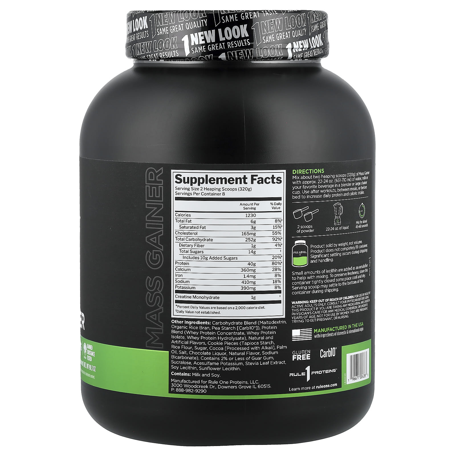 Mistura de Carboidratos (maltodextrina, farelo de arroz orgânico, amido de ervilha [Carb10®]), mistura de proteínas (concentrado de proteína whey, isolado de whey protein, hidrolisado de whey protein), sabores naturais e artificiais, pedaços de cookie (goma de tapioca, farinha de arroz, açúcar, cacau [processado com álcali], óleo de palma, sal, licor de chocolate, sabor natural, bicarbonato de sódio), contém 2% ou menos de goma guar, sucralose, acessulfamo potássico, extrato da folha de estévia, lecitina de soja, lecitina de girassol.