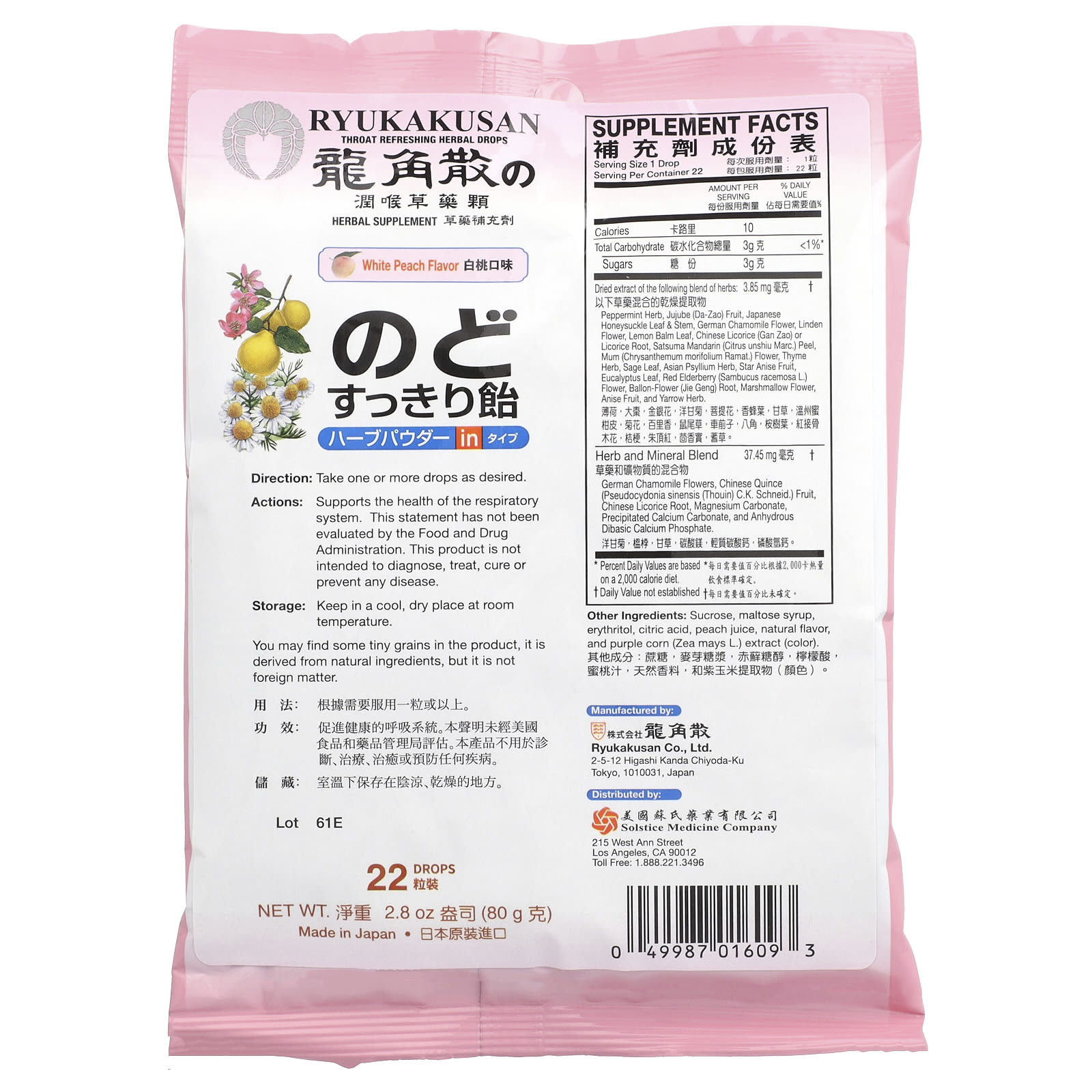 Ryukakusan Gotas de Ervas Refrescantes para a Garganta Pêssego Branco 22 Gotas 80 g (28 oz) – Ryukakusan Cuidados Pessoais Armário do Banheiro Pastilhas para garganta inflamada e tosse.