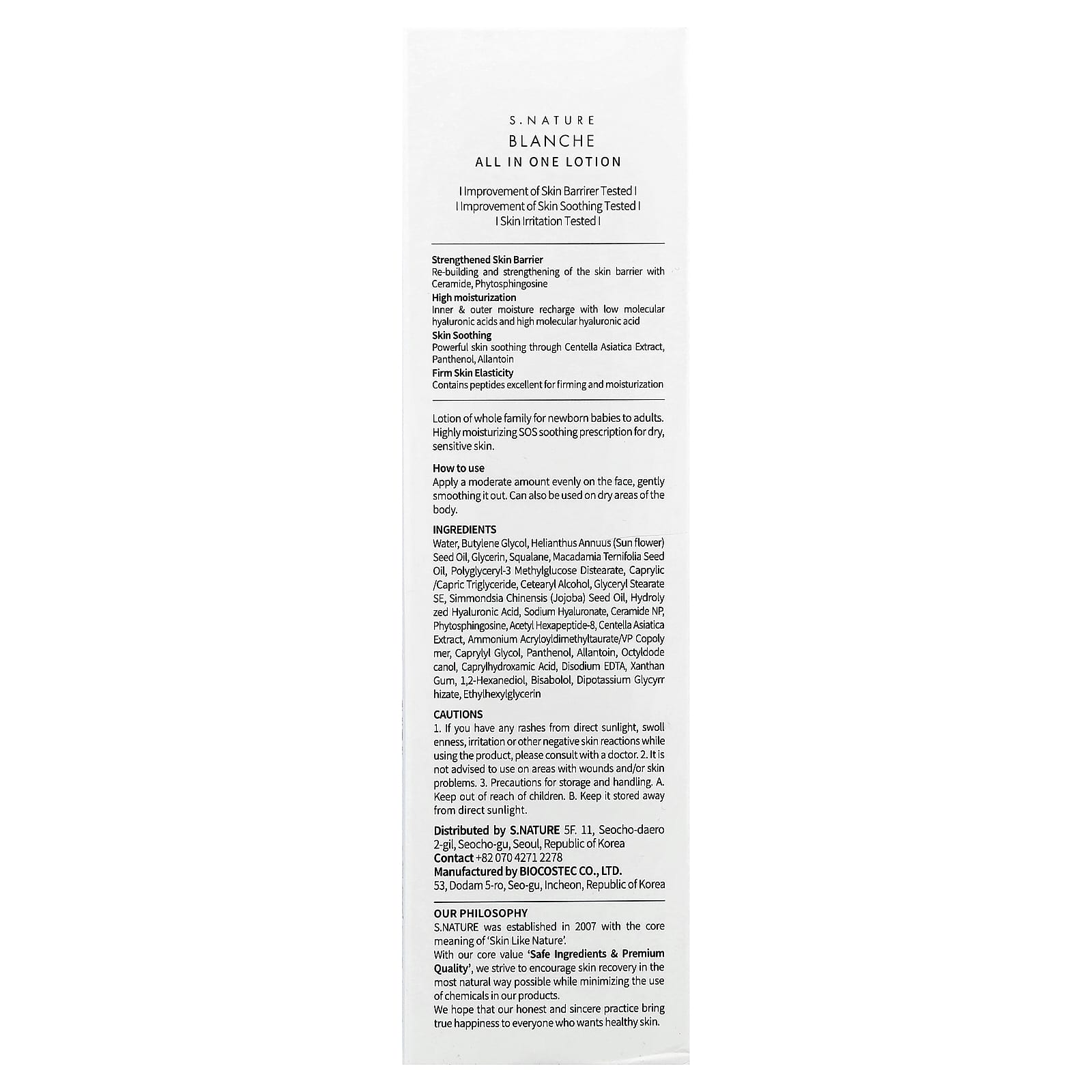 S.NATURE Blanche All in One Lotion Para Pele Muito Seca e Sensível 200 ml – S.NATURE Cuidados Pessoais Cuidados com o Corpo Loção Beleza Beleza por Ingrediente Cuidado para a pele com Centella.