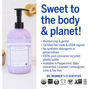 Dr. Bronner's – Sabonete de açúcar orgânico (lavanda, 64 onças) – Feito com óleos orgânicos, açúcar e pó de shikakai, usos 4 em 1: mãos, corpo, rosto e cabelo, limpa, hidrata e nutre, vegano – INGREDIENTES ORGÂNICOS E DE COMÉRCIO JUSTO do USDA: açúcar orgânico e de comércio justo combinado com pó de shikakai orgânico mantém sua pele nutrida, hidratada e macia. Mistura orgânica de óleos de coco, azeitona e cânhamo para uma cremosa tradição de fabricação de sabonetes em espuma de castela! – AROMAS CELESTIAIS: Óleos essenciais puros e açúcar orgânico criam um aroma delicioso. Uma adição elegante ao seu banho e cozinha Os sabonetes orgânicos de açúcar são bons para lavar as mãos, rosto, corpo e cabelo! Prossiga com o enxágue cítrico para cabelos sedosos e macios. – PÓ SHIKAKAI ORGÂNICO: o pó Shikakai, derivado de uma árvore, é usado há muito tempo no cuidado tradicional do cabelo e do corpo indianos. Shikakai condiciona a pele e o cabelo enquanto limpa. Com um pH baixo, é suave no couro cabeludo e no cabelo! – ÓLEO DE PALMISTE ORGÂNICO E DE COMÉRCIO JUSTO: cultivado por pequenos agricultores bem pagos no Equador para garantir técnicas de colheita sustentáveis que não danifiquem os habitats locais, fornecendo a espuma macia e cremosa de nossos sabonetes e beneficiando as pessoas e o planeta. – EMBALADO EM GARRAFAS PLÁSTICAS RECICLADAS 100% PÓS-CONSUMO: A Dr. Bronner's está desviando o plástico descartado dos aterros sanitários usando e aumentando a demanda por garrafas plásticas recicladas. Isso elimina o desperdício e tem um impacto ambiental positivo!