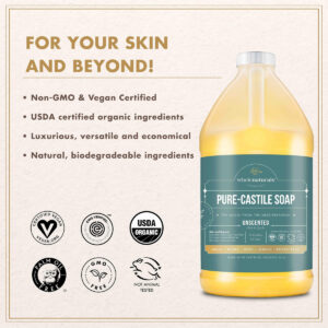 Sabonete líquido puro de castela WHOLENATURALS, sem perfume, verificado pelo EWG e certificado pelo EWG – sabonete natural de 1 galão (64 onças x 2 com bomba), suave e suave, não transgênico e vegano – sabonete orgânico para lavagem corporal, lavanderia e sabonete para bebês