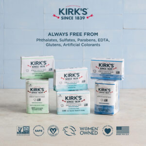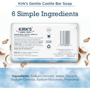 A única marca de sabonete de coco e castela fabricada continuamente desde 1839 e amada por gerações. Nosso sabonete em barra à base de plantas é feito com óleo de coco 100% premium e cria uma espuma suave e cremosa (mesmo em água dura!) deixando a pele macia e saudável. Este sabonete é feito com ingredientes tradicionais de Castela e é clinicamente testado como seguro para peles sensíveis. Nosso sabonete em barra é vegano, livre de crueldade e verificado por um projeto não transgênico. Também é isento de sulfatos, parabenos, ftalatos, EDTA, corantes e glúten. – SABONETE SUAVE DE CASTELA O sabonete de castela Kirks foi desenvolvido para ser suave para a pele. Limpe e acalme a pele seca e irritada e desfrute de hidratação profunda com nosso sabonete de óleo de coco rico em antioxidantes. – O sabonete em barra Kirks de fórmula vegetal, feito com óleo de coco 100% premium, limpa suavemente sem usar ingredientes agressivos e é naturalmente hidratante e hidratante. É igualmente eficaz em águas macias e duras, como água de poço. Kirks é ótimo para toda a família! – O sabonete corporal Kirks Castile é clinicamente testado e seguro para peles sensíveis. Nosso sabonete é vegano, não certificado por OGM e livre de sulfatos, parabenos, ftalatos, EDTA, corantes, glúten e muito mais; o sabonete Kirks Gentle Castile é ótimo para toda a família! Disponível em Original Fresh Scent, sem fragrância/sem perfume e Aloe Vera. – A KIRKS é a única marca de sabonete de coco e castela que é fabricada continuamente desde 1839. Usamos ingredientes naturais para famílias preocupadas com a saúde que desejam produtos de limpeza diários e de alta qualidade, uma limpeza natural com a qual você se sinta bem; da cabeça aos pés e em toda a casa! – WOMEN OWNED A Kirk's pertence e é operada por duas irmãs que se tornaram mães CEOs e é fabricada na América. Nossa família e seus funcionários garantem a qualidade de nossos produtos e acreditam em nossas tradições.