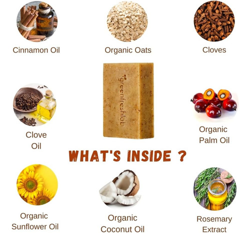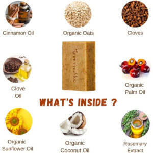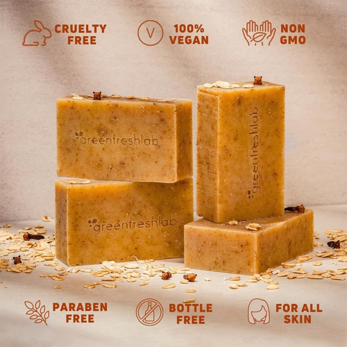 • Ingredientes orgânicos – Cada bar é feita com ingredientes orgânicos certificados e cuidadosamente selecionados para garantir que você esteja dando a sua pele o cuidado mais puro possível. A combinação de óleos e glicerina retida ajuda a manter uma barreira saudável e hidratada da pele, tornando -a adequada para todos os tipos de pele. Conhecidos por suas propriedades calmantes e esfoliantes, a aveia orgânica lustra suavemente a pele seca, deixando -a macia e suave. Os dentes de cravo orgânicos adicionam esfoliação leve e aumentam o perfume natural e terroso do sabão.