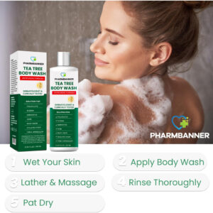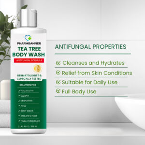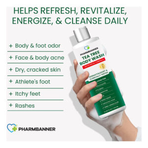PHARMBANNER Tea Tree Body Wash é um sabonete líquido antifúngico poderoso e totalmente natural, projetado para ajudar a aliviar uma variedade de problemas de pele. Infundido com as propriedades curativas naturais do óleo de melaleuca, este sabonete líquido é perfeito para tratar problemas comuns de pele, como acne, eczema, coceira na garganta, pé de atleta, micose, tinea versicolor, odor corporal e hidradenite supurativa. Nossa fórmula limpa suavemente a pele enquanto combate bactérias e fungos nocivos que causam esses problemas de pele. Seguro para uso diário e formulado para todos os tipos de pele, o sabonete líquido PHARMBANNER Tea Tree nutre profundamente a pele sem causar irritação, deixando-a refrescada e revitalizada. Por que escolher PHARMBANNER: O sabonete líquido PHARMBANNER Tea Tree é a solução natural para quem procura uma maneira eficaz, segura e suave de lidar com problemas de pele persistentes enquanto nutre e protege a pele. Confie na PHARMBANNER para suas necessidades de cuidados com a pele e desfrute de uma pele suave, saudável e revigorada todos os dias. – Antifúngico e de limpeza: o sabonete líquido PHARMBANNER Tea Tree é formulado para tratar vários problemas de pele, como foliculite, eczema, acne, dermatite, psoríase, tinea versicolor, micose, coceira, pé de atleta, odor corporal e hidradenite supurativa. Este limpador multifuncional oferece uma abordagem abrangente para o cuidado diário da pele, oferecendo proteção contra infecções cutâneas. – Alívio e hidratação de ação rápida: nossa fórmula suave com infusão botânica alivia a coceira e a pele seca, ao mesmo tempo que acalma a irritação. Com ingredientes hidratantes como azeite de oliva, ele retém a umidade para manter a pele calma, macia e confortável o dia todo. – Ingredientes naturais: feito com óleo de melaleuca e outros ingredientes naturais, garantindo que seja seguro para todos os tipos de pele, incluindo pele sensível. – Uso versátil: ideal para uso no rosto e no corpo, oferecendo cuidados abrangentes para a pele da cabeça aos pés. – Fórmula de uso diário: segura e suave o suficiente para uso diário para homens e mulheres. Como usar: