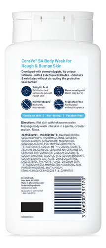 Desenvolvido com dermatologistas, o sabonete líquido CeraVe SA para pele áspera e esfolia, ajudando a restaurar a barreira protetora da pele com três ceramidas essenciais. Este sabonete líquido suave e não irritante esfolia as células mortas da pele para melhorar a textura da pele sem microesferas ou grânulos abrasivos que possam arranhar ou danificar a pele. Sem fragrâncias e parabenos, não comedogênico.