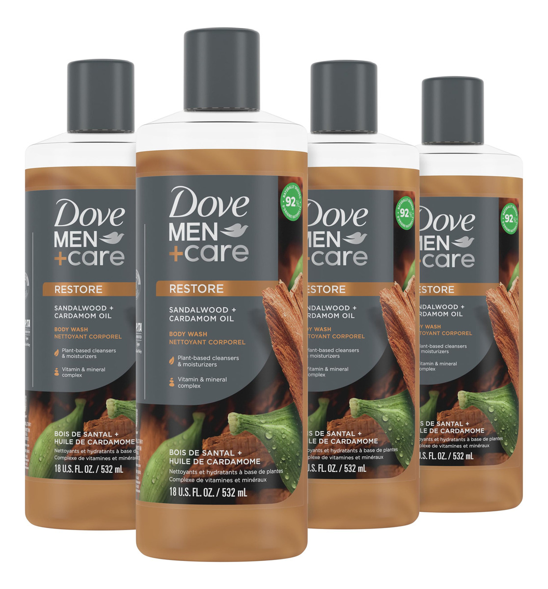 Sabonete líquido DOVE MEN + CARE para uma pele fresca e saudável. Limpador de óleo de sândalo e cardamomo que elimina bactérias com eficácia e nutre sua pele. 18 onças e 4 unidades — RESTAURADOR E REFRESCANTE: experimente o sabonete líquido Dove Men PlusCare Sandalwood plus cardamomo para uma pele mais saudável e suave. Este sabonete líquido apresenta um aroma quente e convidativo para que você se sinta restaurado – Este sabonete líquido é formulado com 93% de ingredientes de origem natural, produtos de limpeza e hidratantes vegetais e óleos essenciais naturais – SABONETE CORPORAL HIDRATANTE: o sabonete líquido Dove Men PlusCare Sandalwood plus cardamomo apresenta uma espuma cremosa que renova a pele – LIMPEZA REFRESCANTE: sinta-se limpo e revigorado com este limpador hidratante e aproveite aroma quente de sândalo e cardamomo — Projetado para homens: a pele masculina é diferente. Os homens suam mais, têm uma pele mais grossa e perdem a hidratação mais rapidamente. Nosso sabonete líquido é desenvolvido especificamente para hidratar e proteger a pele masculina contra o ressecamento.