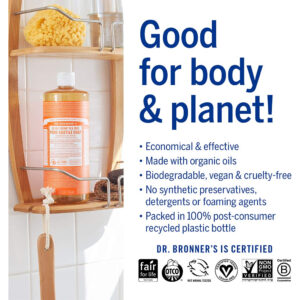 Dr. Bronner's – Sabonete líquido puro de castela (melaleuca, 1 galão) – Feito com óleos orgânicos, 18 em 1 usos: pele propensa a acne, caspa, lavanderia, animais de estimação e pratos, concentrado, vegano, não transgênico – FEITO COM ÓLEOS ORGÂNICOS E INGREDIENTES CERTIFICADOS DE COMÉRCIO JUSTO: os sabonetes líquidos de castela pura Dr. Bronner são feitos com mais de 70% de ingredientes orgânicos certificados e de comércio justo, promovendo comunidades saudáveis e trabalhando de forma ética condições e preços justos. – ÓLEO DE PALMA ORGÂNICO E DE COMÉRCIO JUSTO: cultivado por pequenos agricultores com salários justos no Equador para garantir técnicas de colheita sustentáveis que venceram não danifique os habitats locais, fornecendo a espuma suave e cremosa de nossos sabonetes e, ao mesmo tempo, beneficiando as pessoas e o planeta. – SEM CONSERVANTES SINTÉTICOS, DETERGENTES OU AGENTES ESPUMANTES: Nossos sabonetes líquidos são feitos com ingredientes vegetais. Você pode pronunciar conservantes, espessantes ou agentes espumantes sintéticos, o que é bom para o meio ambiente e ótimo para sua pele! – 3 VEZES MAIS CONCENTRADO DO QUE A MAIORIA DOS SABONETES LÍQUIDOS: Dilua! Dilua! Vários usos para apenas um produto: lavanderia, esfregar, lavar pratos à mão, limpeza multiuso, lavar animais de estimação e muito mais. Mais sabão por garrafa significa menos desperdício na embalagem! – EMBALADO EM GARRAFAS PLÁSTICAS RECICLADAS 100% PÓS-CONSUMO: A Dr. Bronner's está desviando o plástico descartado dos aterros sanitários usando e aumentando a demanda por garrafas plásticas recicladas. Isso elimina o desperdício e tem um impacto ambiental positivo!