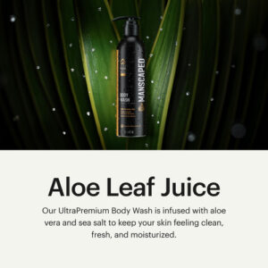 O gel de banho MANSCAPED UltraPremium contém aloe vera e sal marinho para manter a pele limpa, fresca e hidratada. Ele usa uma fórmula limpa, vegana e sem corantes, perfumada com uma autêntica colônia refinada.