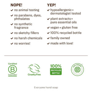 Sabonete líquido para mãos Everyone, 12,75 onças (pacote com 1), limão e tangerina Meyer, limpador vegetal com óleos essenciais puros — Contém: (1) frascos de plástico 100% reciclado de 12,75 onças do sabonete líquido Everyone Meyer Lemon and Mandarim — Perfume: O sabonete para mãos Everyone Meyer Lemon and Mandarim combina dois óleos essenciais rejuvenescedores poderosos para criar uma mistura brilhante e revigorante. Obtenha aquelas mãos limpas com as quais você pode ficar feliz – Use: use generosamente, esfregue as mãos para fazer bolhas espumosas, enxágue e desfrute de mãos limpas e hidratadas e cheirosas. Para uso por todos – Clean Promise: Everyone para mãos é verificado pelo EWG, livre de transgênicos, livre de crueldade, sem glúten, sem triclosan e sem fragrâncias sintéticas – Missão Zero Waste: Em 2019, desviamos 90% de nossos resíduos dos aterros sanitários. Nossas embalagens são feitas de material reciclado. Também usamos embalagens 100% recicláveis para envio de pedidos
