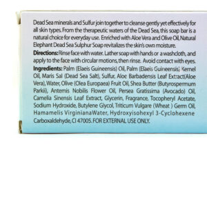 Os minerais do Mar Morto e o enxofre se unem para limpar sua pele de forma suave e eficaz. Esta barra de sabonete natural e rica em minerais é a solução simples para suas preocupações com a limpeza facial. Ele funciona em conjunto com a umidade natural da pele para limpar e nutrir suavemente, deixando a pele visivelmente saudável e revigorada. Descobriu-se que um esfoliante diário reabastecedor com este sabonete ajuda a reduzir e aliviar os problemas de acne e irritação da pele, conforme mencionado por muitos de nossos clientes frequentes. Enriquecido com aloe vera e azeite de oliva, nosso sabonete de enxofre do Mar Morto é a melhor escolha para revitalizar naturalmente sua pele. Adequado para todos os tipos de pele. Sal do Mar Morto, esfolia e restaura a pele com minerais vitais Saiba mais sobre os benefícios dos ingredientes do Aloe Vera do Mar Morto, reduz a vermelhidão e irritação na pele. Óleo de oliva e abacate, protege e nutre a pele com vitaminas essenciais – LIMPE – Trate todos os tipos de pele com este tratamento de enxofre e minerais do Mar Morto. O sal do Mar Morto esfolia e restaura a pele com minerais vitais. – ENRIQUECIDO – O sabonete natural de enxofre para elefantes contém aloe vera e azeite de oliva para nutrir a pele. Aloe Vera, reduz a vermelhidão e irritação na pele. O óleo de oliva e abacate protege e nutre a pele com vitaminas essenciais. – MULTIAÇÃO – Pode ser usado para tratar manchas no corpo e também para combater a acne, a psoríase e muito mais no rosto. – TERAPÊUTICO – Este poderoso tratamento pode ser usado para eliminar espinhas e outros irritantes da pele. O Mar Morto contém 21 minerais poderosos que melhoram a saúde da pele. – SATISFAÇÃO GARANTIDA – Garantimos que, se você não gostar do nosso produto nos primeiros 30 dias, poderá devolvê-lo para obter um reembolso total. Entre em contato conosco se tiver alguma dúvida sobre este ou qualquer um dos nossos produtos.