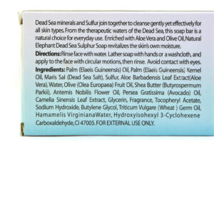 Os minerais do Mar Morto e o enxofre se unem para limpar sua pele de forma suave e eficaz. Esta barra de sabonete natural e rica em minerais é a solução simples para suas preocupações com a limpeza facial. Ele funciona em conjunto com a umidade natural da pele para limpar e nutrir suavemente, deixando a pele visivelmente saudável e revigorada. Descobriu-se que um esfoliante diário reabastecedor com este sabonete ajuda a reduzir e aliviar os problemas de acne e irritação da pele, conforme mencionado por muitos de nossos clientes frequentes. Enriquecido com aloe vera e azeite de oliva, nosso sabonete de enxofre do Mar Morto é a melhor escolha para revitalizar naturalmente sua pele. Adequado para todos os tipos de pele. Sal do Mar Morto, esfolia e restaura a pele com minerais vitais Saiba mais sobre os benefícios dos ingredientes do Aloe Vera do Mar Morto, reduz a vermelhidão e irritação na pele. Óleo de oliva e abacate, protege e nutre a pele com vitaminas essenciais – LIMPE – Trate todos os tipos de pele com este tratamento de enxofre e minerais do Mar Morto. O sal do Mar Morto esfolia e restaura a pele com minerais vitais. – ENRIQUECIDO – O sabonete natural de enxofre para elefantes contém aloe vera e azeite de oliva para nutrir a pele. Aloe Vera, reduz a vermelhidão e irritação na pele. O óleo de oliva e abacate protege e nutre a pele com vitaminas essenciais. – MULTIAÇÃO – Pode ser usado para tratar manchas no corpo e também para combater a acne, a psoríase e muito mais no rosto. – TERAPÊUTICO – Este poderoso tratamento pode ser usado para eliminar espinhas e outros irritantes da pele. O Mar Morto contém 21 minerais poderosos que melhoram a saúde da pele. – SATISFAÇÃO GARANTIDA – Garantimos que, se você não gostar do nosso produto nos primeiros 30 dias, poderá devolvê-lo para obter um reembolso total. Entre em contato conosco se tiver alguma dúvida sobre este ou qualquer um dos nossos produtos.